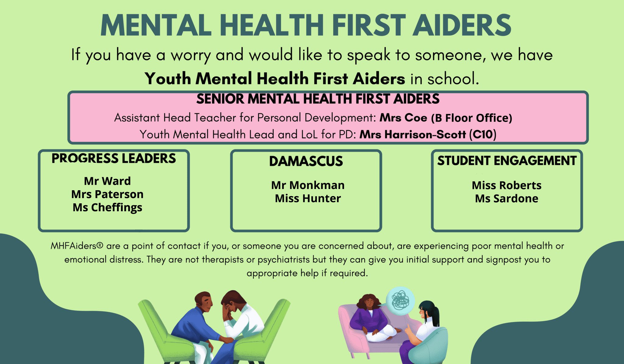 We have our very own Mental Health First Aiders, who are fully qualified staff equipped to help you, they are;